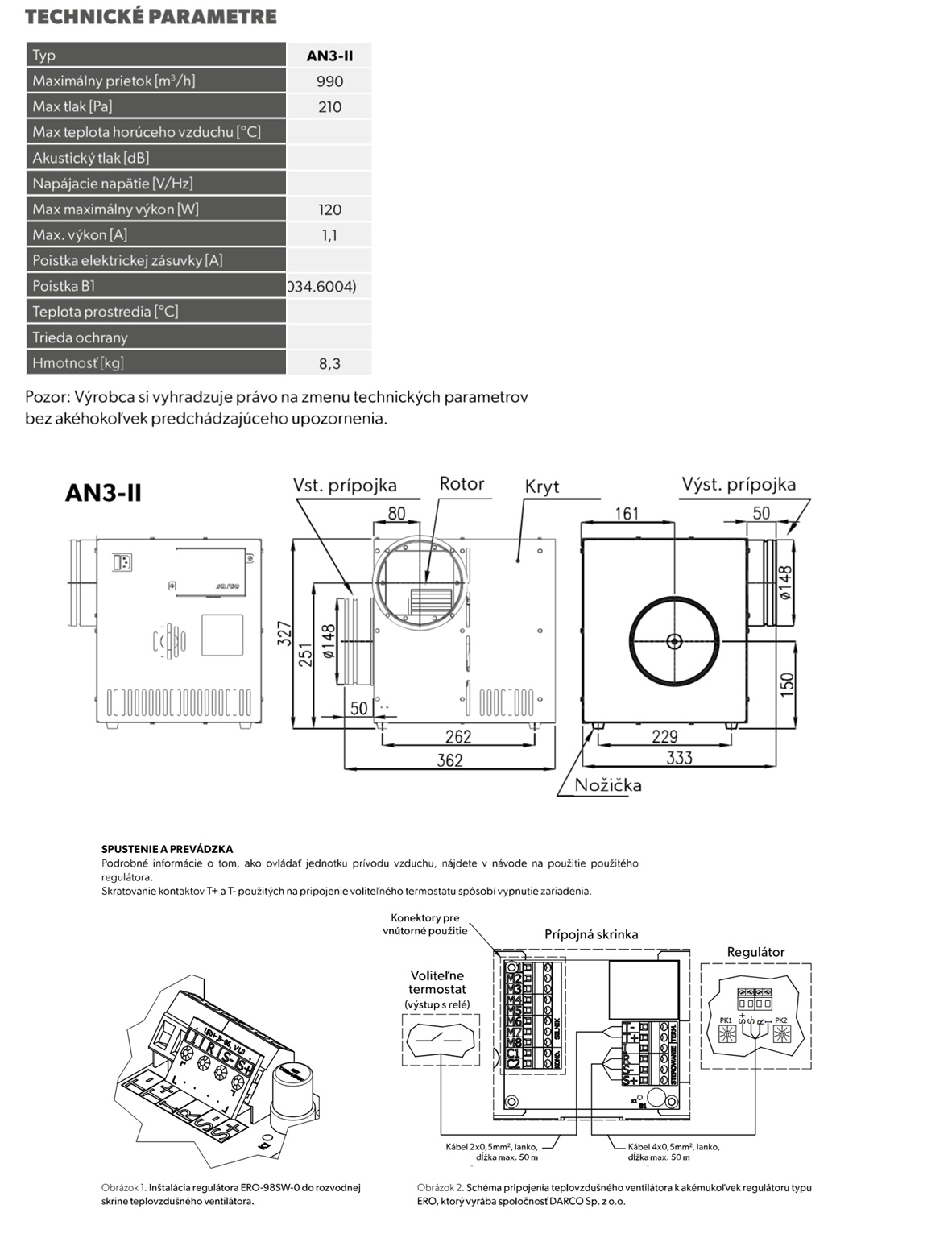 3. externý termostat – slúži na zapnutie ventilátora pri zadanej teplote. Keď teplota klesne pod stanovenú hodnotu, ventilátor sa vypne Ventilátor Darco AN3-II má elektronicky komutovaný (EC) motor najnovšej generácie (EC = electronically communicated). EC motor je jednosmerný motor riadený externou elektronikou. Keďže otáčky motora riadi externý regulátor, motor nemá obmedzené synchrónne otáčky. Umožňuje plynulý rozbeh z minima do maxima, nie je potrebný rozbehový prúd. EC motor je energeticky úsporný, čo garantuje významnú úsporu spotreby elektrickej energie oproti štandardnému AC asynchrónnemu motoru. Krbový ventilátor Darco AN3-II je vhodný do energeticky úsporných inštalácií teplovzdušných rozvodov. EC motor vykazuje vysokú účinnosť aj pri nízkych otáčkach. Výhodou použitia EC motorov je tiež bezproblémová regulácia otáčok, s vysokou účinnosťou v plnom rozsahu (0 až 100%). Výrobok je šetrný k životnému prostrediu, vyrábaný v súlade so smernicou EÚ RoHS