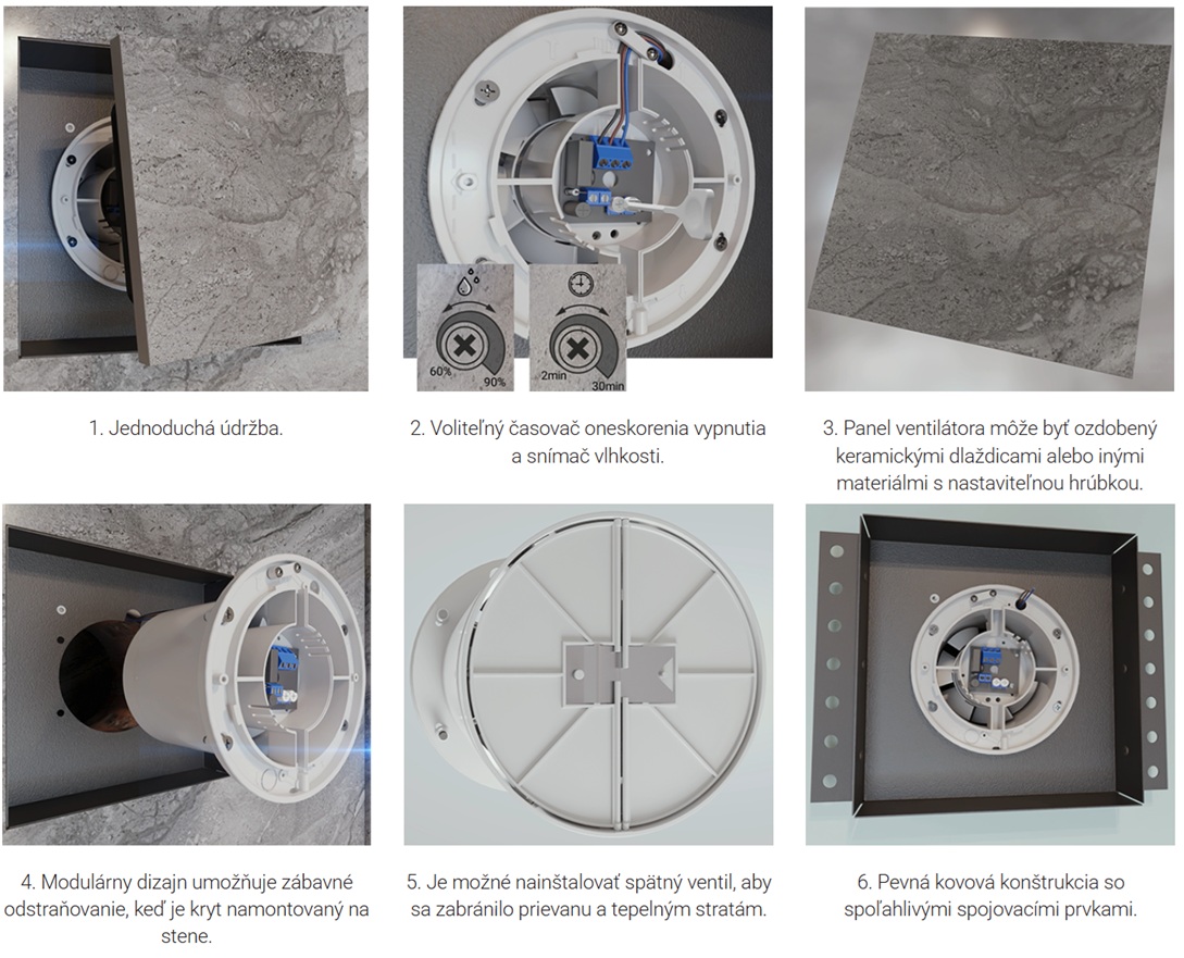 keramické dlaždice alebo akýkoľvek iný dekoratívny kryt.Ventilátor sa inštaluje priamo do otvoru