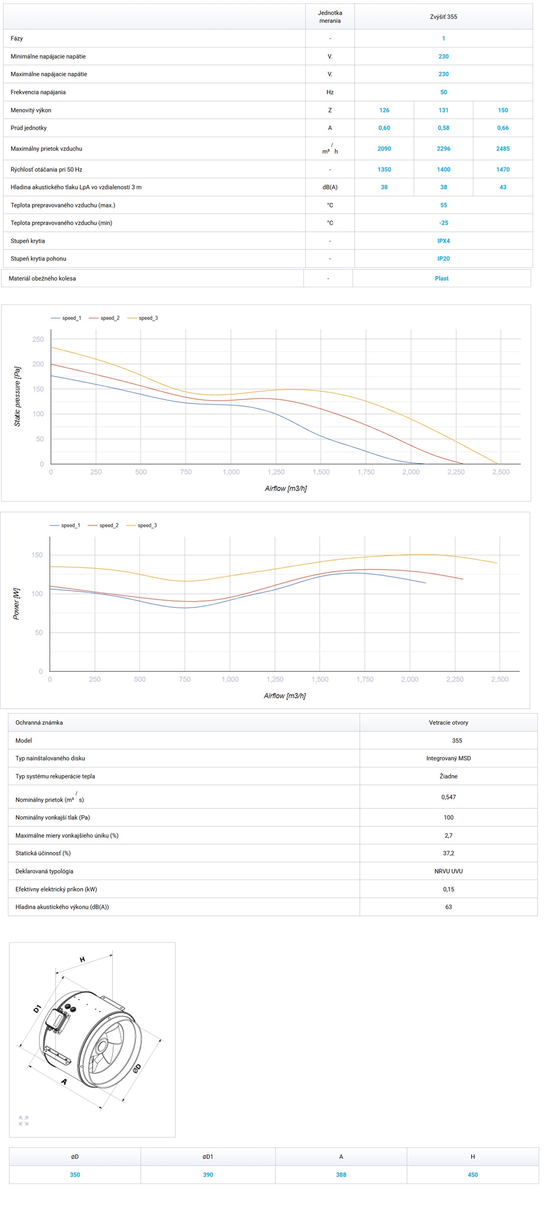 VENTS 355 BOOST trojrýchlostný výkon 2090-2296-2485m3/h