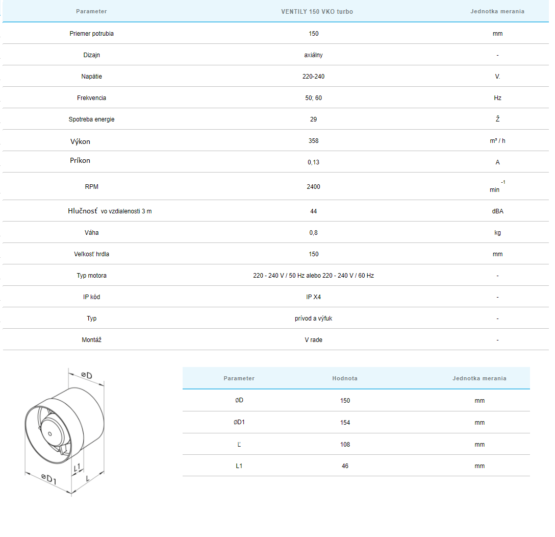 Potrubný ventilátor výkon:358 m3 do potrubia 150mm VENTS 150VKO TURBO--zvýšený výkon-riadenie vypínačom na svetlo.