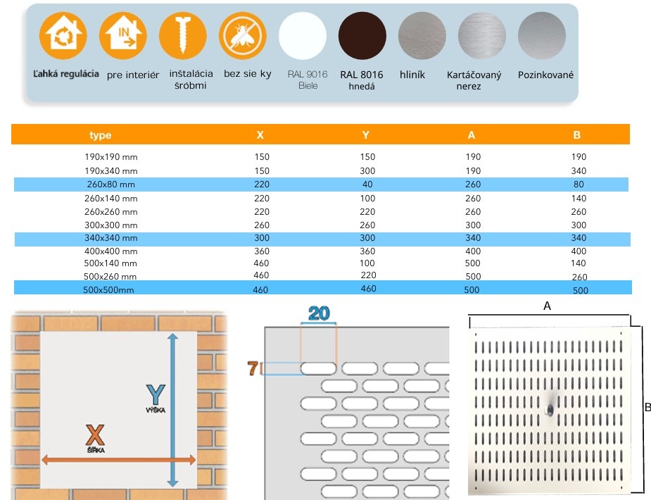Vetracia mriežka z hliníkového plechu. Farba:Biela.Na zadnej časti sa nachádza sieťka proti hmyzu ..